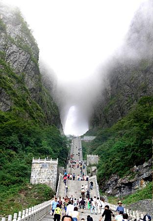 天門山是張家界海拔最高的山,因自然奇觀天門洞而得名。天門山古稱嵩梁山,三國時期,嵩梁山一峭壁忽然裂開,宛如一扇門,吳帝覺得這是吉兆,于是嵩梁山也由此易名天門山。