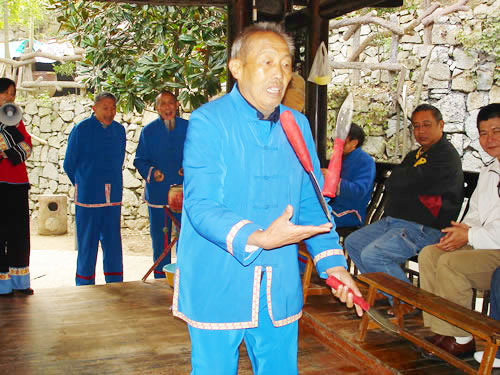 三棒鼓,唐代稱三仗鼓,約于明代傳入張家界,并逐漸成為群眾喜聞樂見的民間藝術(shù)形式。每年春節(jié),藝人們結(jié)伴走村串寨拜年,表現(xiàn)對象不分貧富,戶戶必到。如遇貧寒之家,表演者將別家贈送的禮品相送,意在人人過節(jié)歡喜。充分體現(xiàn)出土家人熱情好客,心地善良的民族性格。對加強民族間團結(jié)有一定的作用。三棒鼓 通常由三至五人組成,一人擊鼓唱詞,一人鑼鼓配樂,一人;ò;ò羧,長一尺,舞者左右 各執(zhí)一根,將另一根拋在空中,左右開弓,擊打空中花棒使之不落地。也有以刀代棒,以五刀代三棒的技藝。鋼刀在空中歡跳,銀光閃閃,左右穿梭。技藝高強者,突然把刀拋得及高,來一個騰空飛腳,轉(zhuǎn)身外擺,繼續(xù)接刀上拋,令人眼花繚亂,不禁稱絕。打三棒鼓,通常有“鬧春耕”、“收割打場”、“慶豐收”、“拜年節(jié)”四套,分“鯉魚跳龍門”、“玉女穿梭”、“板巖漂灘”等項目。打三棒鼓技巧性強,表演時需高度集中,用力適當,貫通一氣,并與演唱者默契配合。