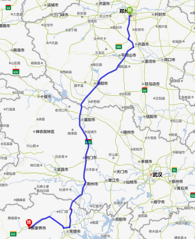 左右,沿途經過鄭州——平頂山——南陽——襄陽——荊門——荊州——常德(也可以走國道經澧縣、石門縣)——慈利——張家界。