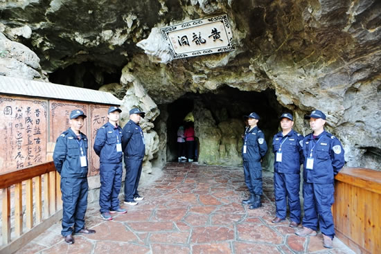 保護重于利用,開放服從保護。4月16日一大早,筆者在黃龍洞景區(qū)看到,一支英姿颯爽的保安隊伍邁向洞內各自指定的崗位。