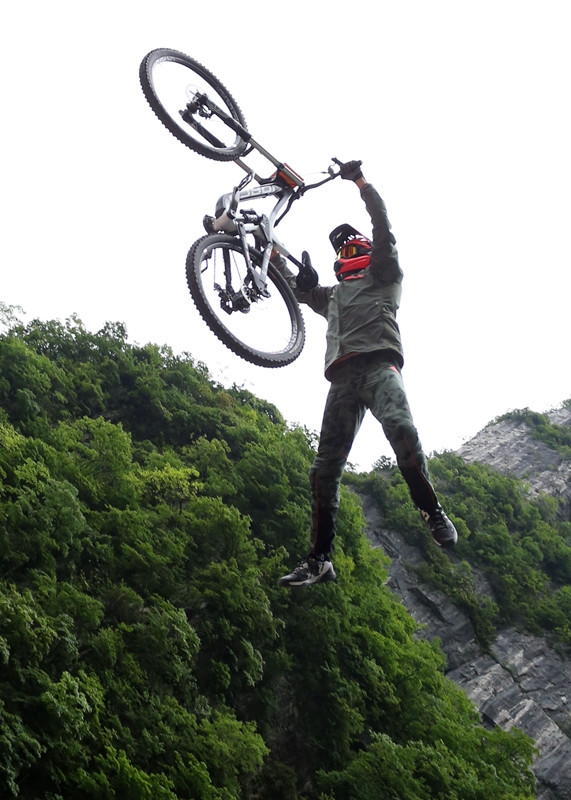 自行車運(yùn)動(dòng)包含了公路自行車和山地自行車,而山地自行車又包含眾多種類,BMX小輪車,攀爬車, XC(越野山地車),AM(全山地車山地車),DH(山地速降)等。其中,DH屬于山地自行車運(yùn)動(dòng)中最重型車種,騎行最具挑戰(zhàn)性、觀賞性、技巧性。DH山地速降最典型的賽道是在山上,樹林中,天門山999級(jí)臺(tái)階速降騎行對(duì)于DH山地車速降來說更具挑戰(zhàn)性。整條臺(tái)階沒有平坦路面,一路顛簸下山,中途沒有可調(diào)整的機(jī)會(huì),要求車手有極高的控車能力,天梯平均陡度39度以上,僅是站立在臺(tái)階上就已經(jīng)感覺一覽眾山小了,站在自行車上更是陡峭,天梯一路筆直下山,加上其坡度,車手的速度可想而知,也更是車手對(duì)車子的控制力的一個(gè)新挑戰(zhàn)。賽道中還加設(shè)了跳臺(tái),車手在應(yīng)付如此高難度臺(tái)階路段同時(shí),還要進(jìn)行跳躍,更是難上加難。天門山天梯速降賽被業(yè)界譽(yù)為“世界上難度最大,對(duì)選手技術(shù)要求最高的速降賽”,其極高的難度和無與倫比的觀賞性成為世界范圍內(nèi)最精彩最具挑戰(zhàn)性的自行車速降比賽之一。