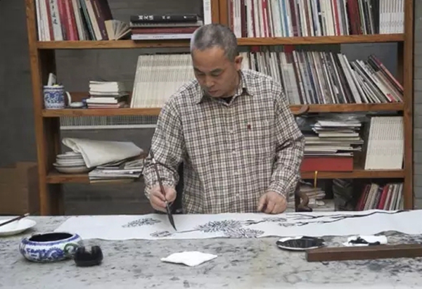 張家界山水畫(huà)卷作者楊靜在創(chuàng)作中
